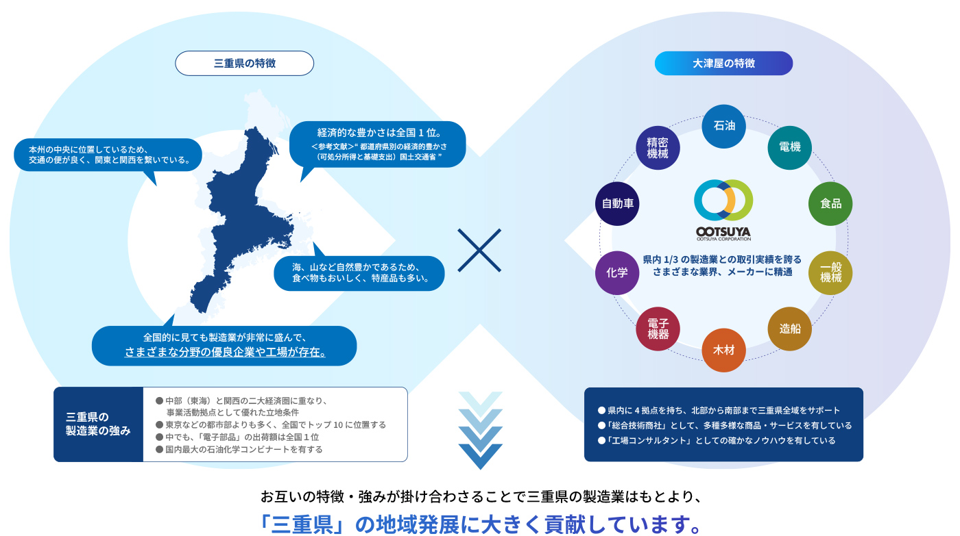 創業以来、三重県を拠点とする大津屋は、地域の製造業の成長に尽力してきました。三重県は製造業が非常に活発な地域であり、特に自動車産業や半導体産業は全国的にみても有数の工業地域として知られています。また、県内には約4,000の製造業関連の事業所が存在し、その中で当社は1/3にあたる約1,300社との取引実績を有しています。売上の約95%を三重県のお客様が占め、この数字が地域への貢献度を示しています。さらに、三重県出身のスポーツ選手やスポーツチームへのスポンサーシップを通じて、地域全体の発展にも取り組んでいます。